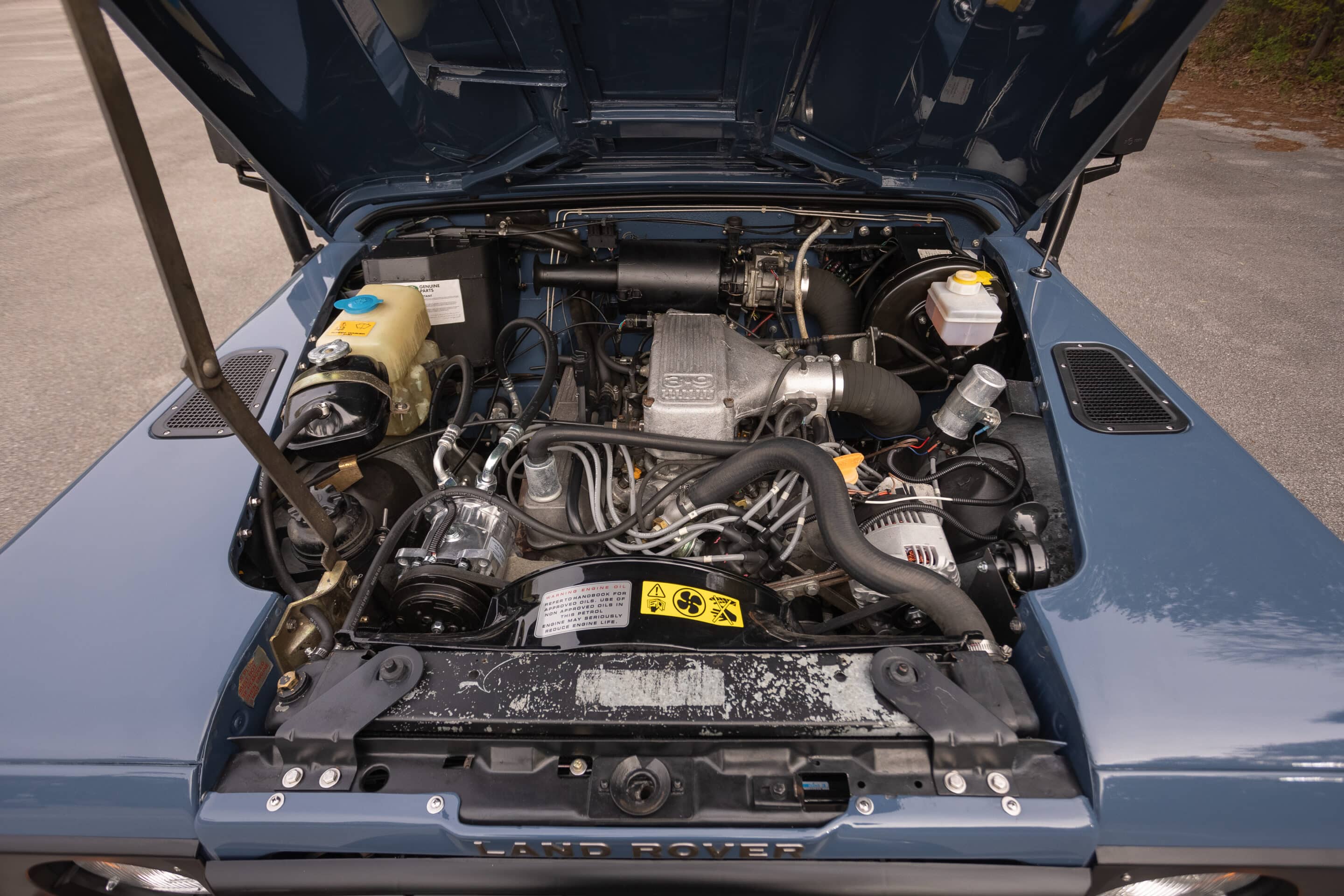 This Defender has been elevated by a comprehensive frame-off restoration completed in 2023 which included several key upgrades: a rebuilt 4.6L V8 engine, a new R380 5-speed manual transmission, new clutch, air conditioning system, Exmoor Trim soft top, BFGoodrich All-Terrain KO2 265/75/16 tires, refinished 16” alloy wheels, alloy hinges with stainless steel hardware, refinished exterior metals and plastics, new interior matting, an ALPINE stereo with Focal speakers, LED lighting, and a stainless steel exhaust. These upgrades enhance reliability and modern usability while preserving the authentic NAS Defender character.